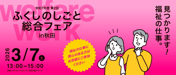 秋田県社会福祉協議会では、福祉業界で働く方や福祉の分野で学ぶ方、福祉のお仕事をお探しの方等に対し、さまざまなサポートや各種研修を行っています。ぜひ、ご利用ください。