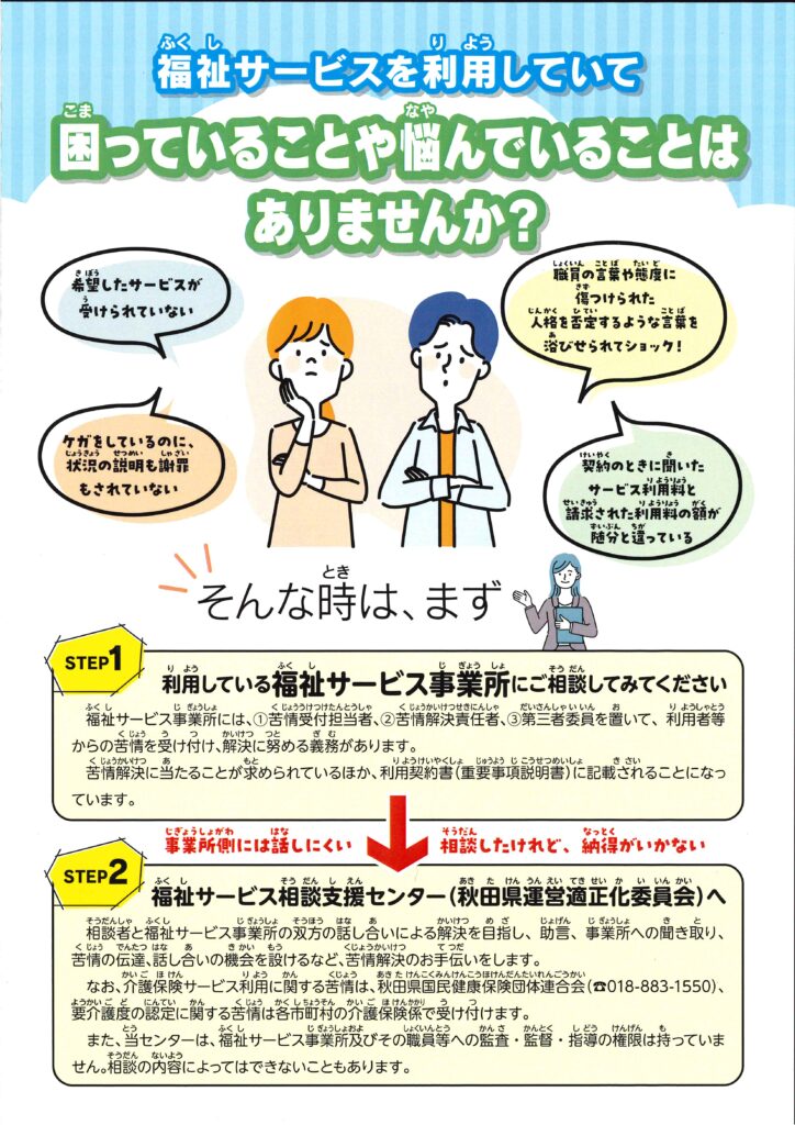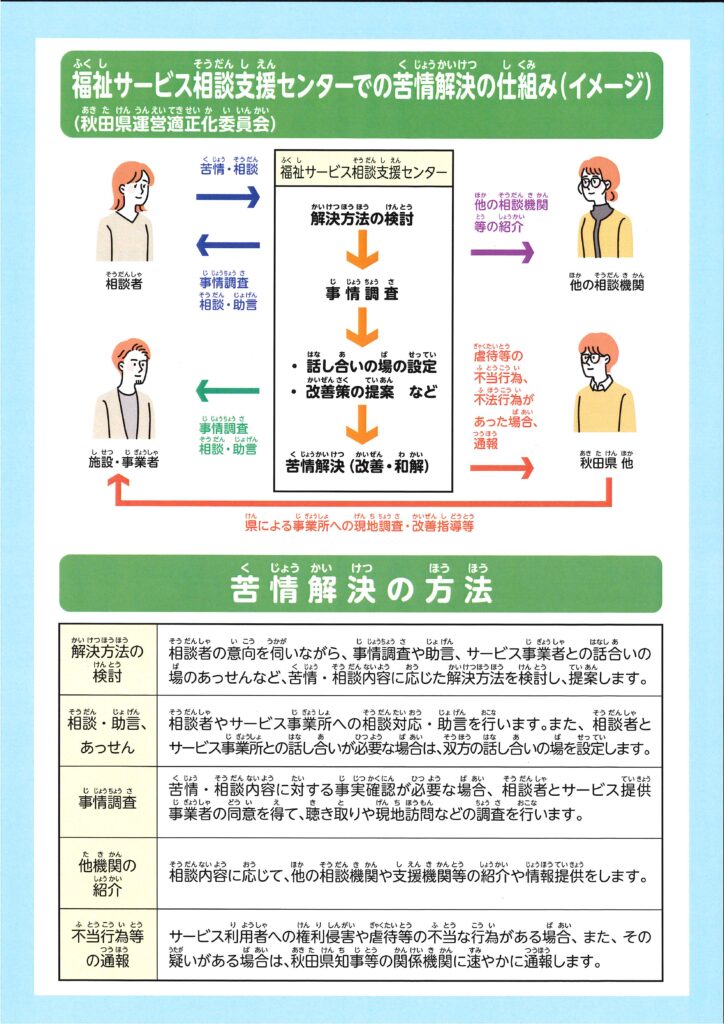 秋田県運営適正化委員会は、このような福祉サービスの利用に関する「苦情」の解決のお手伝いをしています。